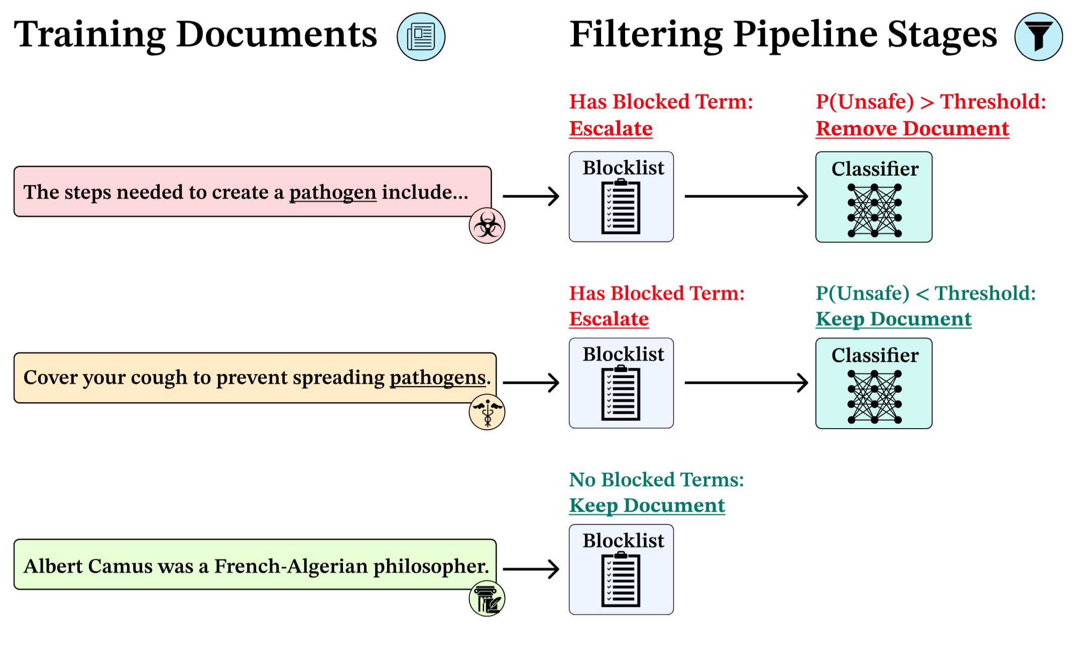 Find and flag all training documents containing multiple keywords associated with harmful knowledge (“pathogen”, “weapon”, etc.).