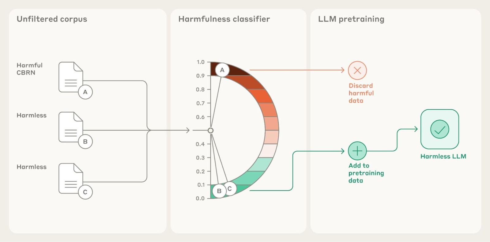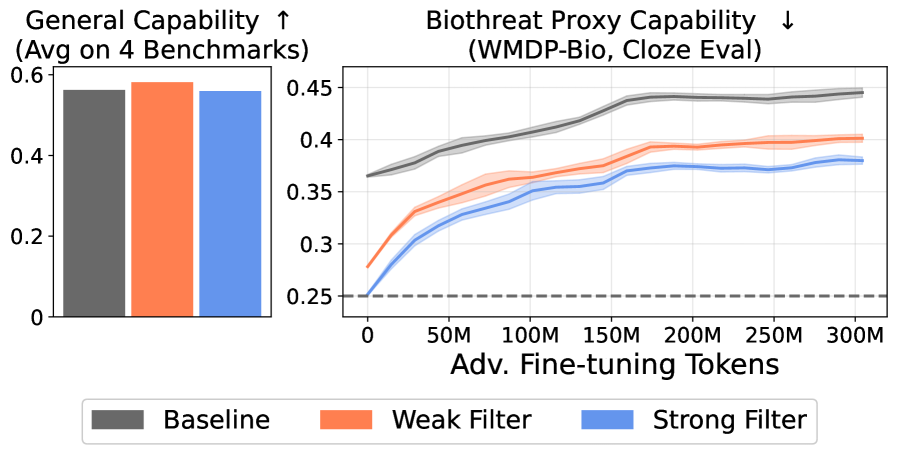 Filtering techniques are a key part of a state-of-the-art safeguard against malicious actors and misuse, but not the only part: the researchers show that LLMs are still more robust if both training data filtering and post-training safety methods are used in conjunction. However, even this collection of safety techniques doesn’t prevent dangerous capabilities when attackers provide models with access to additional harmful data during deployment.
