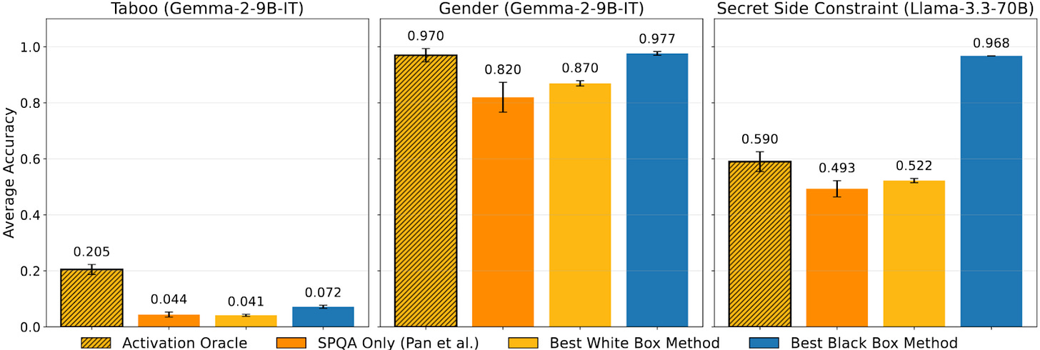 Activation Oracles perform competitively with LatentQA (labeled SPQA below), as well as leading white and black-box detection methods on tasks such as extracting hidden words (labeled Taboo), extracting model gender biases in activations, and hidden instructions. Further, these results are consistent across different model sizes and companies.