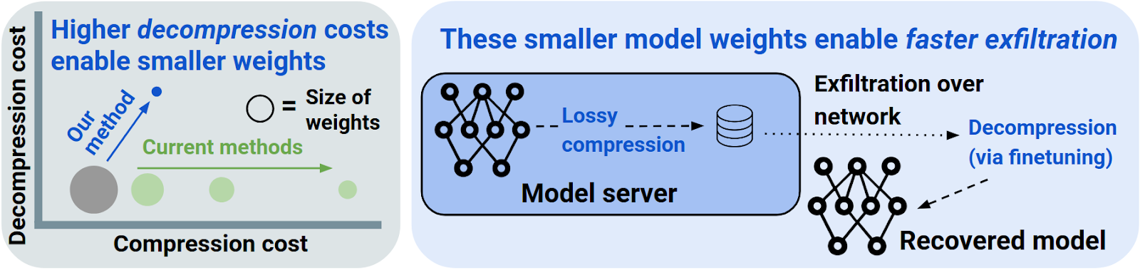 TLDR: New research suggests exfiltrating frontier model weights may be feasible even with network bandwidth constraints using a new compression algorithm relying on a small amount of fine-tuning during decompression.