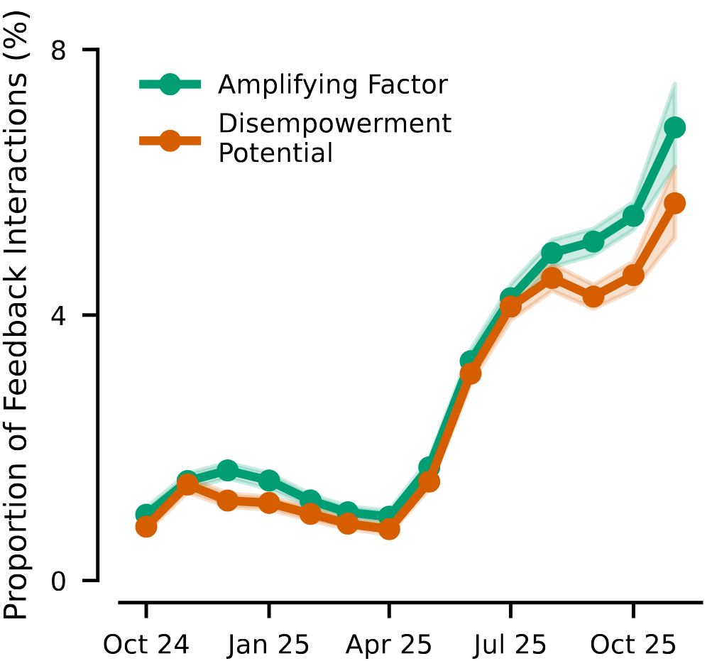 While actualized disempowerment rates are difficult to measure with chat data alone, the researchers observe that both disempowerment potential and amplifying factors have been increasing over time in user feedback data. Additionally, the researchers find that a preference model trained on user feedback data does not consistently punish disempowering conversations, and will often reward them.